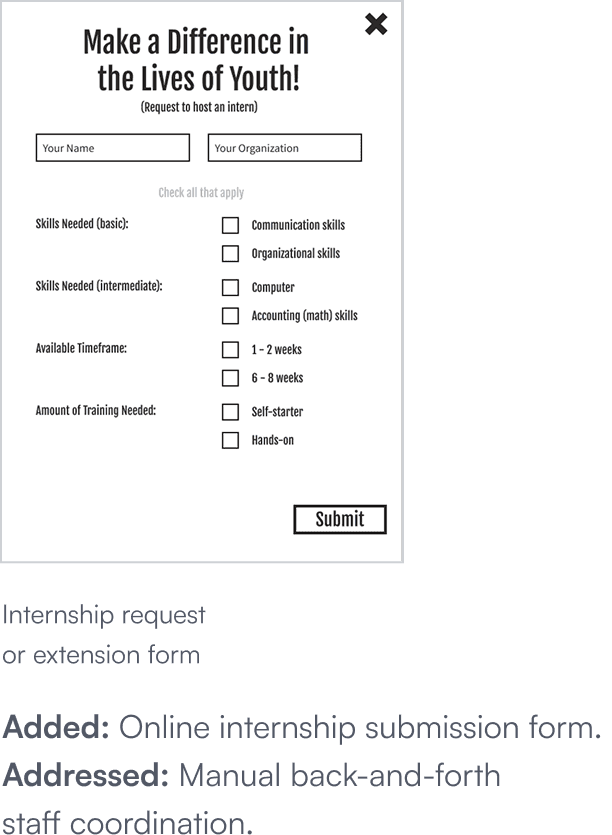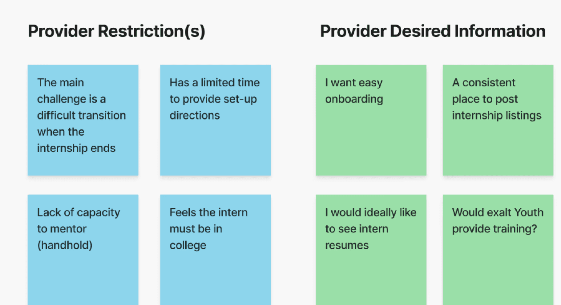 After interviewing five providers and synthesizing insights, we identified recurring concerns around intern matching, job readiness, and visibility into intern backgrounds, none of which were addressed in the current portal. Returning providers also had no clear way to extend placements online and were required to call for next steps.