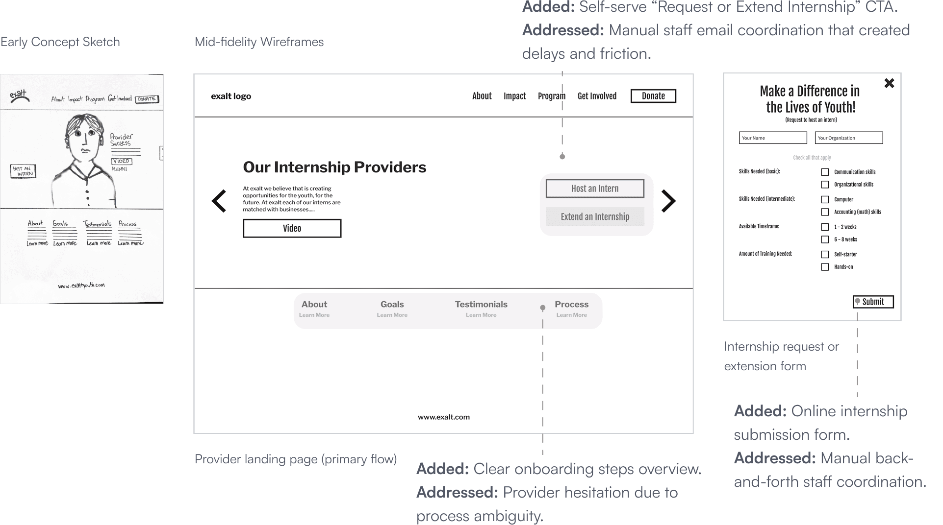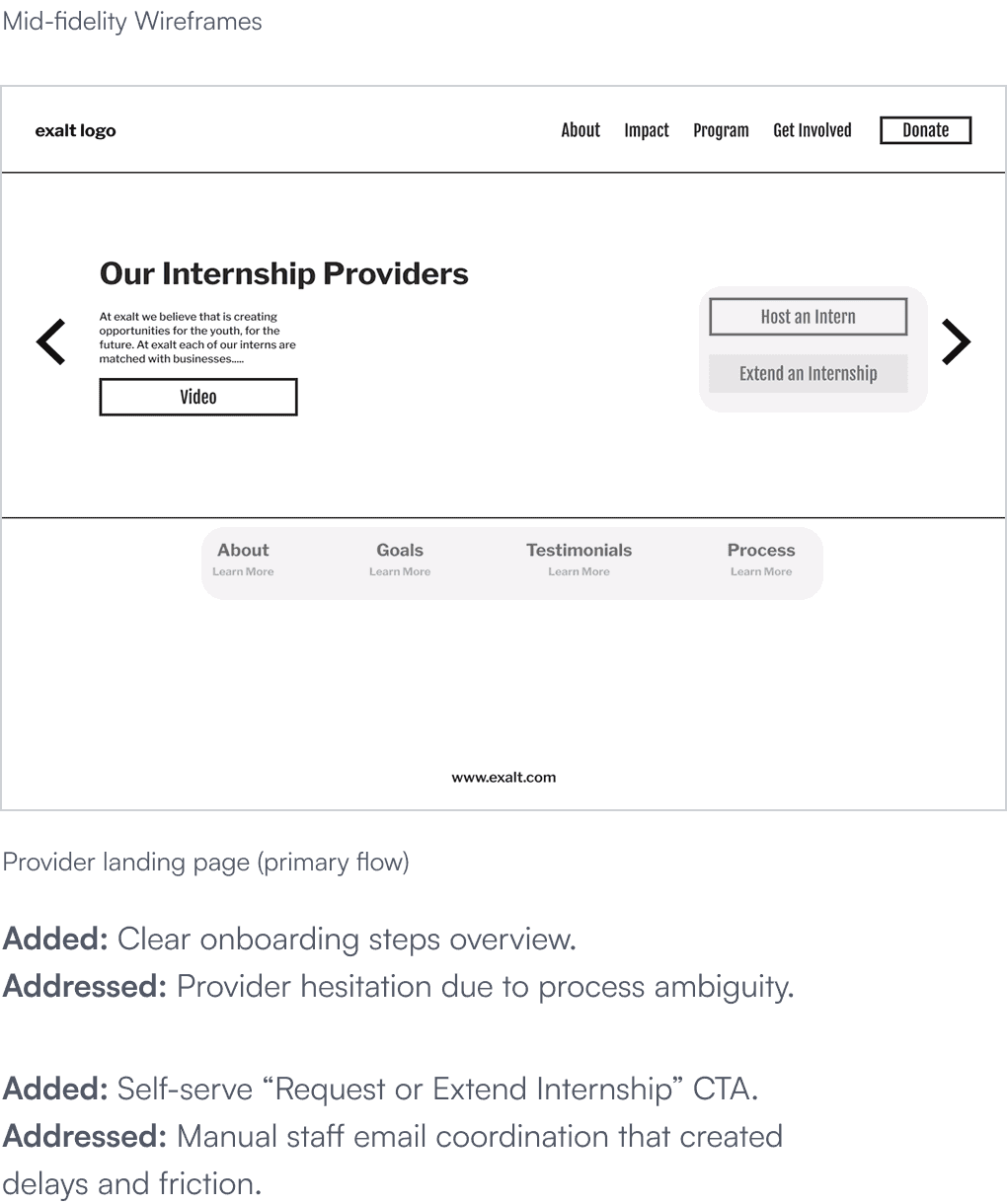 To understand the root of repeated provider inquiries, we began with stakeholder interviews. exalt knew providers were calling because the site lacked key information, but it wasn’t clear what was missing. We spoke with past and prospective internship providers and asked: